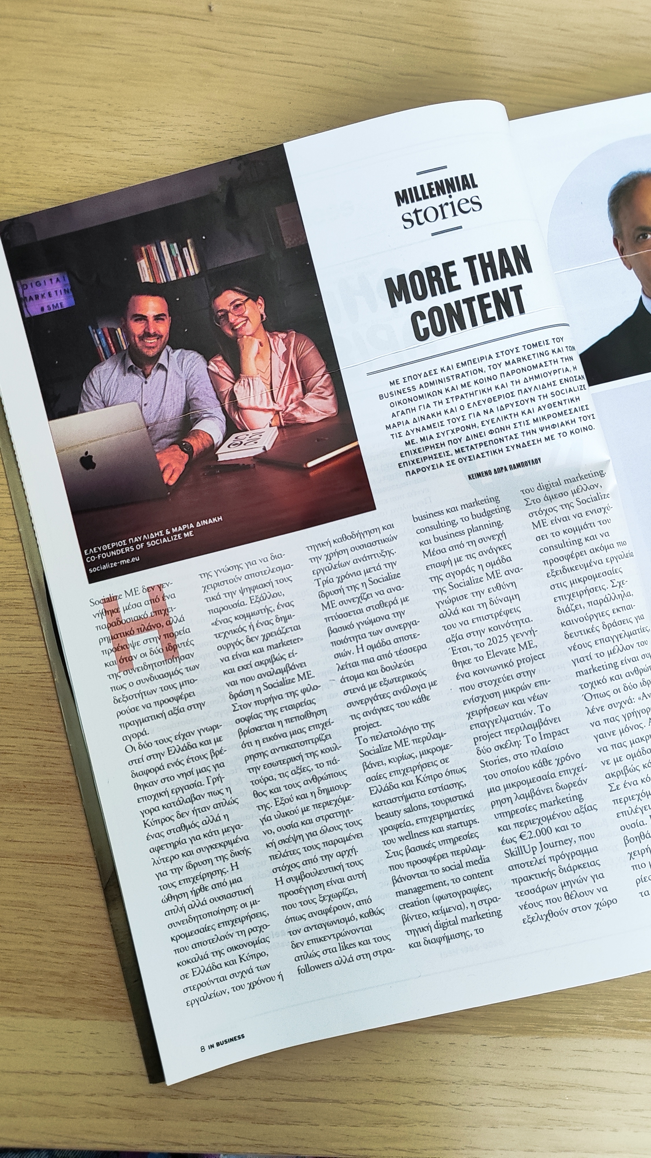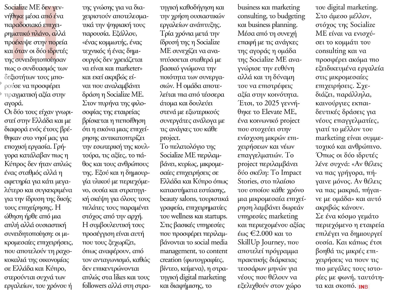 Η συνέντευξη και το αφιέρωμα επικεντρώνεται στις ρίζες και την εξέλιξη της Socialize ME: από την εποχική εργασία στην Κύπρο, μέχρι τη δημιουργία ενός δημιουργικού brand που σήμερα υποστηρίζει μικρομεσαίες επιχειρήσεις με στρατηγική, περιεχόμενο και consulting που κάνει τη διαφορά.