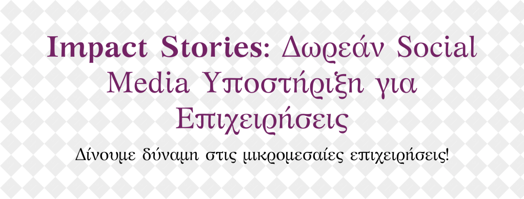 Το Impact Stories είναι η κοινωνική δράση του προγράμματος Elevate ME, μέσω της οποίας στηρίζουμε μία επιλεγμένη μικρή επιχείρηση κάθε χρόνο, παρέχοντας δωρεάν υπηρεσίες social media για 4 μήνες.